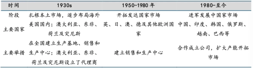 面对兴奋发展的全球阛阓,卡特彼勒在施行国内产能的同期,开动布局国外阛阓。1950年,公司于英国成立了第一家国外子公司,这符号着其从一家好意思邦原土企业向全球巨头的转型。1954年公司进入巴西阛阓并于次年开发巴西圣保罗工场。后续接踵进入了澳大利亚、加拿大等阛阓,国外收入占比由60年代初期的37%进步至1980年的57%。