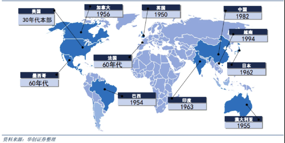 一是起步早,赶上了全球主要阛阓的基建激昂。1925年由霍尔特和贝斯特消亡成立卡特彼勒后,其就在澳大利亚、东非、荷兰及突尼斯诞生了代理商。在大稀疏时代依靠出口苏联缓冲原土下滑的需求。二战肃除后,得当全球化波澜,积极股东产能、渠说念及售后服务的全球化布局。尔后的“马歇尔议论”又为卡特彼勒提供了出海机遇,先后进入英国等欧洲阛阓,以及澳大利亚、加拿大等发达国度,深入参与战后重建。1980年后,中国、印度等发展中国度快速崛起,又为其提供了繁密的增量阛阓。