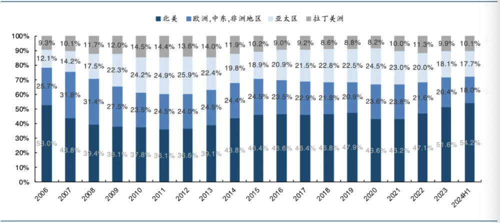 2006-2024卡特彼勒各地区收入占比变化