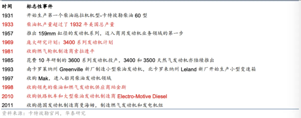与全球化扩展同样,卡特彼勒的业务多元化蔓延也在格外早期的时期就开动了。而且通过赓续的里面研发插足和外部收并购的格局,将业务从早期的农用机械拓展至建筑、工业燃气轮机、柴电机车、矿山等多界限。以卡特彼勒极具竞争上风的发动机业务为例,其赓续通过自研及收购保管发动机居品的最初性能及产量。