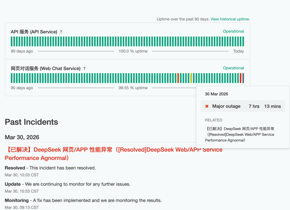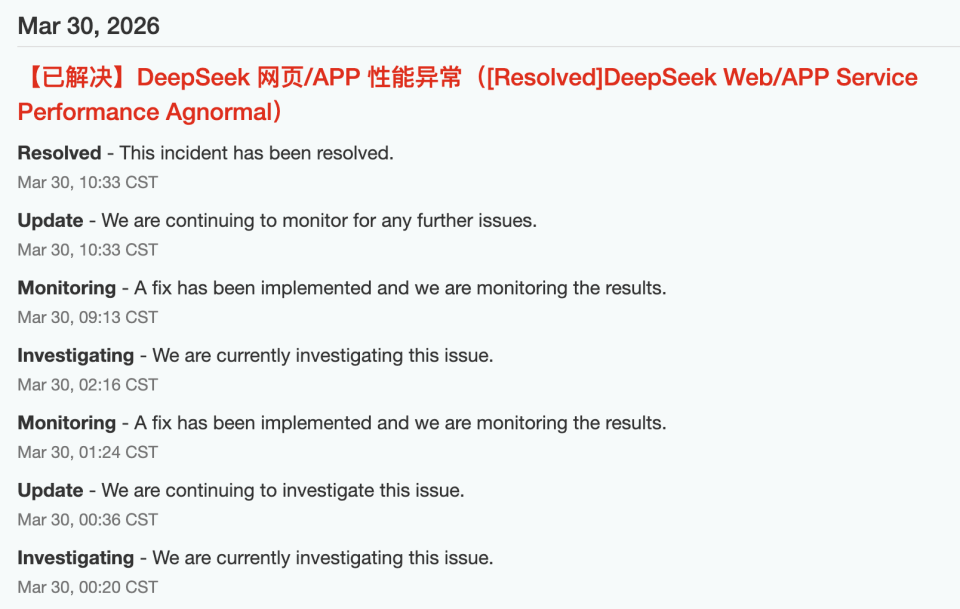 凭据DeepSeek官方情景页公布的信息,DeepSeek于3月30日00:20初次介入问题排查,并在01:24和09:13两次发布配置更新并监控配置死一火,到第二次发布配置更新,职业中断接近9个小时,到问题最终贬责,举座捏续10个小时独揽。