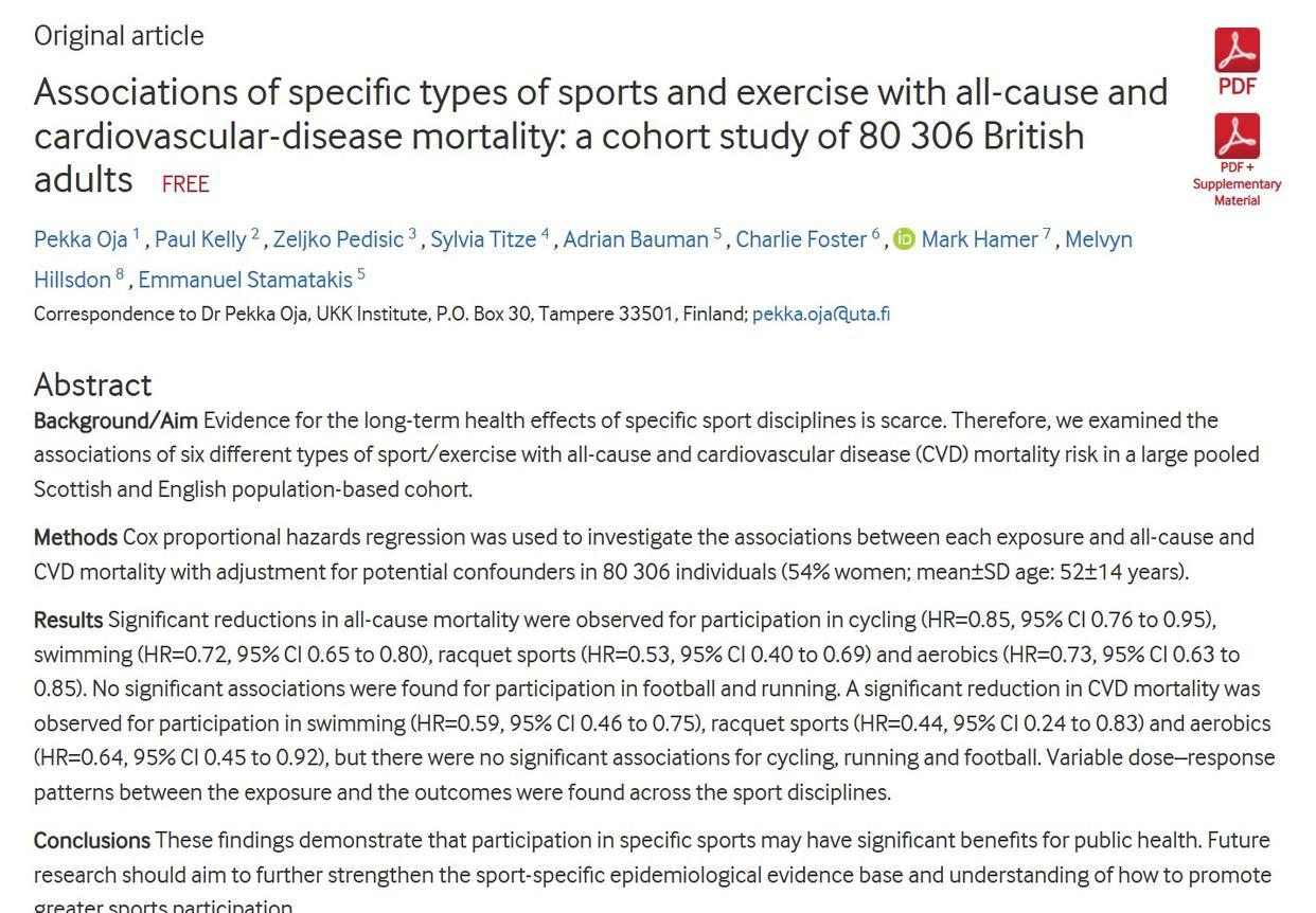 然则,这种思自然的健康共鸣,在严谨的医学大数据眼前却遭到了颠覆。一项发表在顶级医学期刊《英国畅通医学杂志》(BJSM)上、跟踪了超越8万名受试者且长达9年的大型究诘给出了一个出东说念主预思的论断:要是以“裁减心血管疾病逝世风险”为最终揣测圭臬,排在榜首的既不是被誉为畅通之王的拍浮,也不是普及度最高的跑步,而是挥拍畅通。